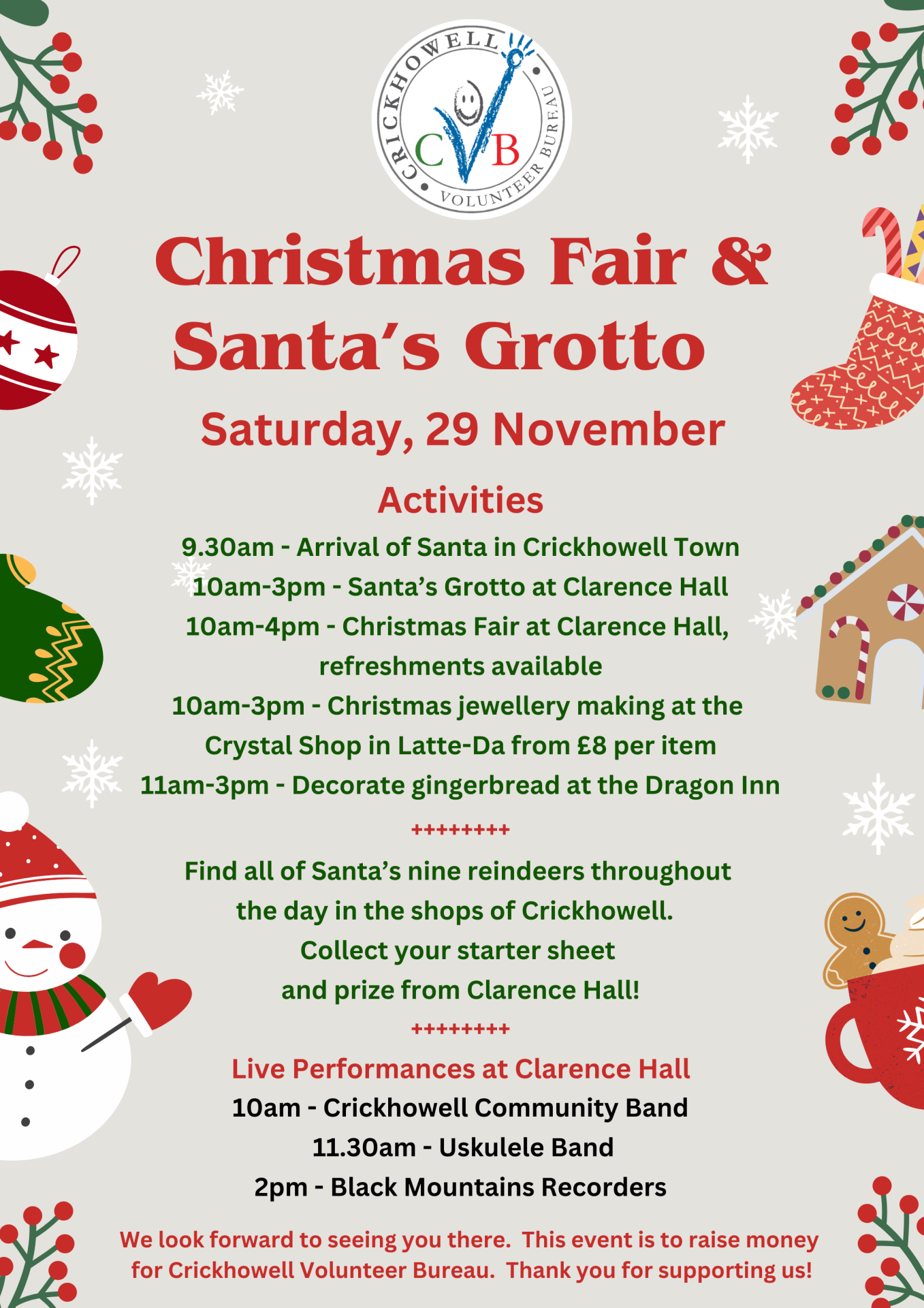 Crickhowell Volunteer Bureau is hosting its annual Christmas Fair & Santa’s Grotto at the Clarence Hall on Saturday, 29 November, offering a day filled with festive activities for the family.
